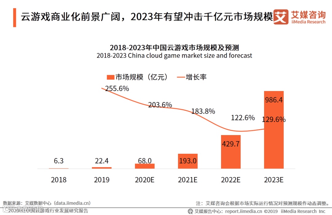 iiMedia Research(艾媒咨询)数据显示,2019年中国云游戏市场规模约为22.4亿元。艾媒咨询分析师认为,在新基建带动下,云游戏的规模化及商业化前景愈发明朗,行业整体发展进程快步推进,预计2023年云游戏市场规模将冲击千亿元大关。