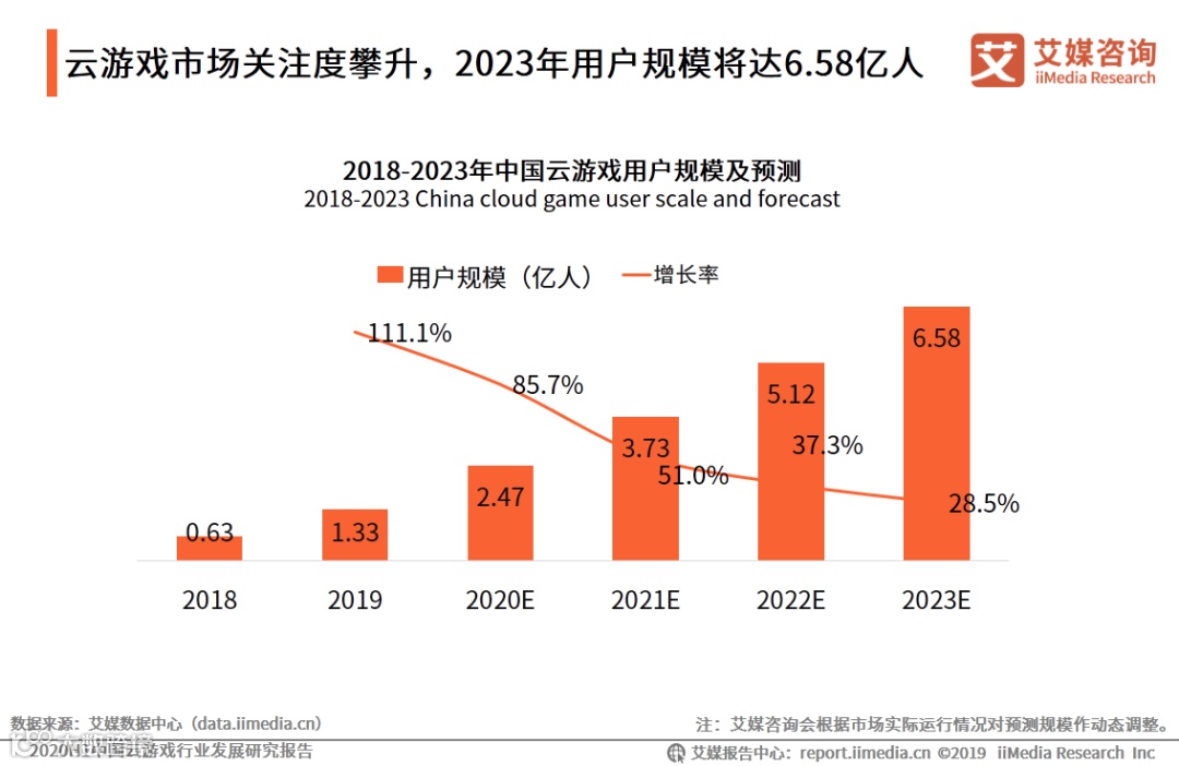 iiMedia Research(艾媒咨询)数据显示,2019年云游戏用户规模约为1.33亿人,预计2023年用户规模将达6.58亿人。艾媒咨询分析师认为,2020年加速变革创新,挖掘增长新机是多数行业的共同主题。云游戏作为游戏产业未来强劲增长点,其关注程度和景气度持续攀升,产业多方的加速布局为用户规模的持续高速增长夯实了基础。