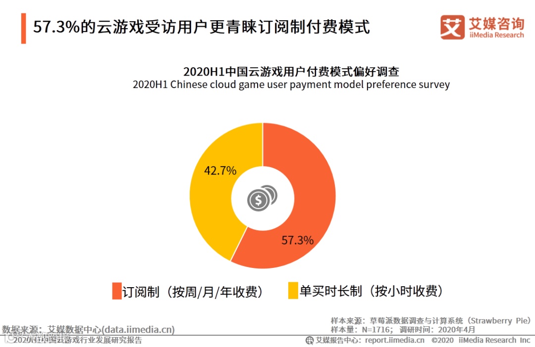 iiMedia Research(艾媒咨询)数据显示,在目前较主流的两种付费方式中,按周/月/年收费的订阅制更受到云游戏用户的欢迎,占比达57.3%;偏好按小时收费的单买时长制的受访用户占42.7%。