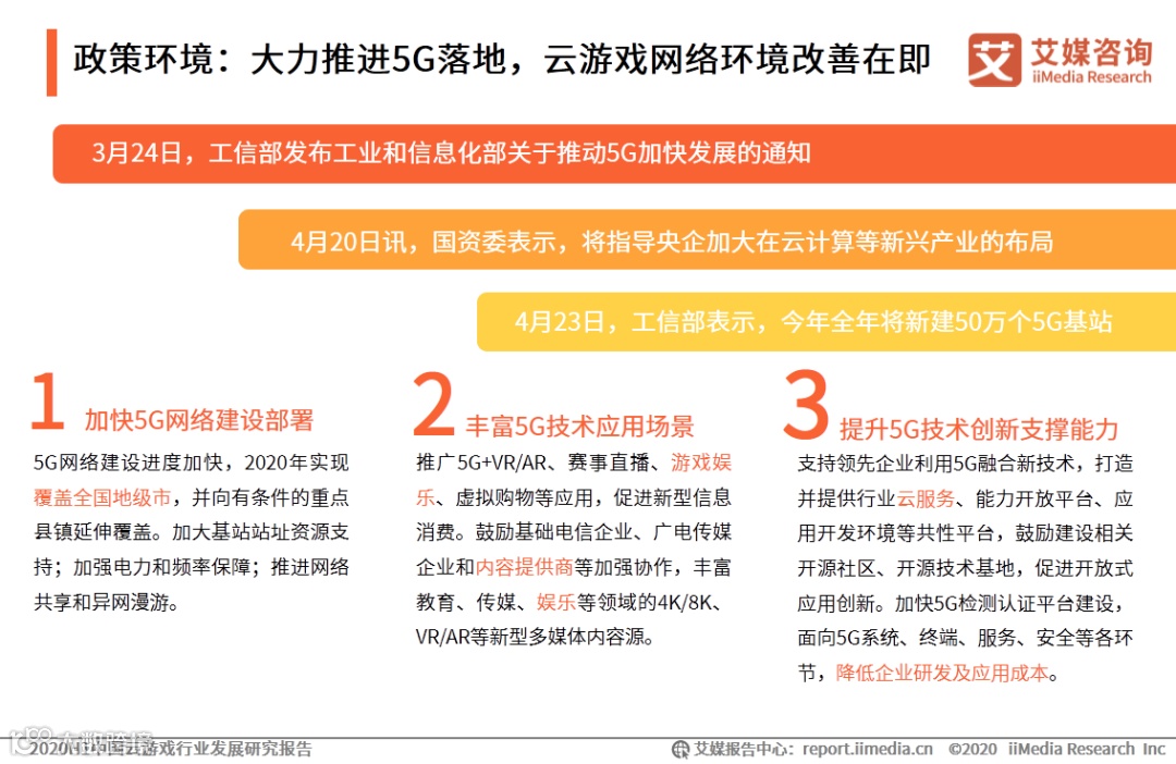 艾媒咨询分析师认为,各地政府密集部署新基建政策,将加速5G网络基础设施以及数据中心的铺设和建立,这将利好云游戏商业化发展。一方面,云游戏产业长期存在的画面延时、画面不清晰、画面抖动等技术难点都将得到解决;另一方面,5G网络的普及将有效降低云游戏带宽资源成本。综上,云游戏商业化进程在新基建的带动下将取得实质性突破。