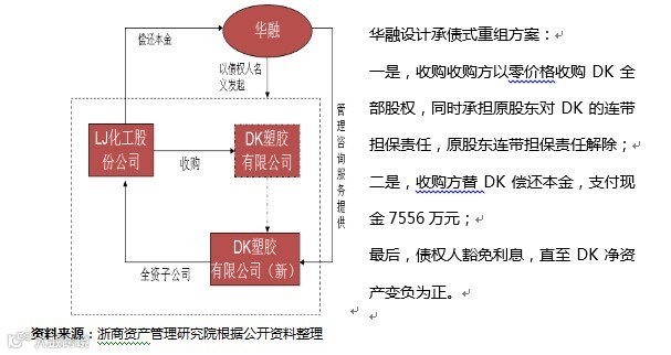重组并购+管理咨询。华融以被并购方债权人的身份发起并购,并对并购后的企业提供管理咨询,加快债权回收,实现双方共赢。以DK为例,华融从工行接受DK债权本金5902万,债权共12313万元。经评估,DK总资产12597万元,总负债15118万元。具体交易结构见下图。