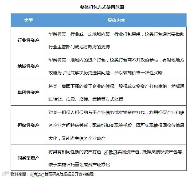 整体打包方式。将单笔资产处置成本高而价值小、单笔资产处置难度大、周期长、资产分布过于分散等不良资产按照行业、地域、集团等一定特性,进行整体打包、集体处置。主要适用于行业性资产、地域性资产、集团性资产、担保性资产和同类型资产。