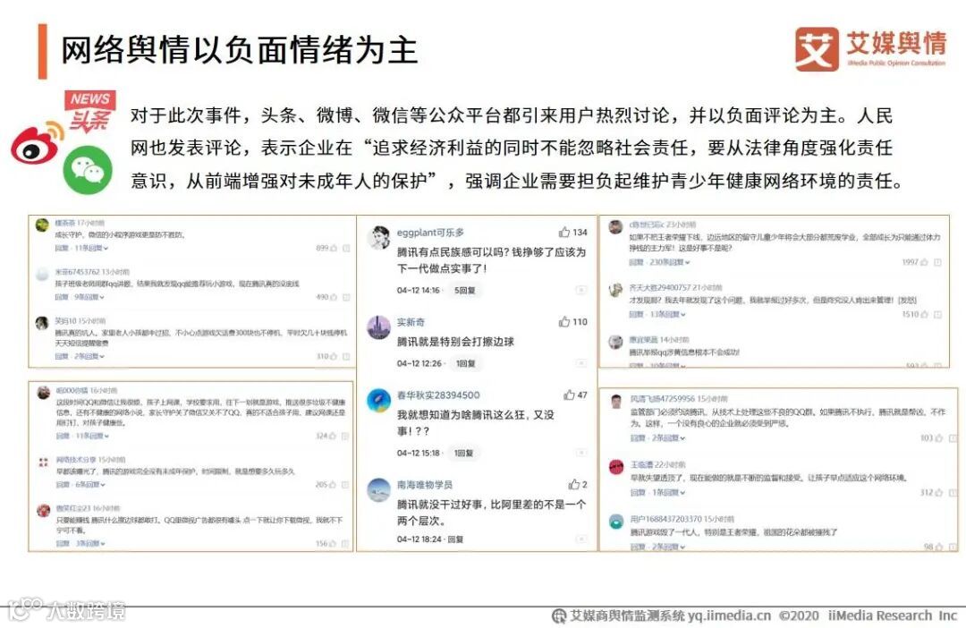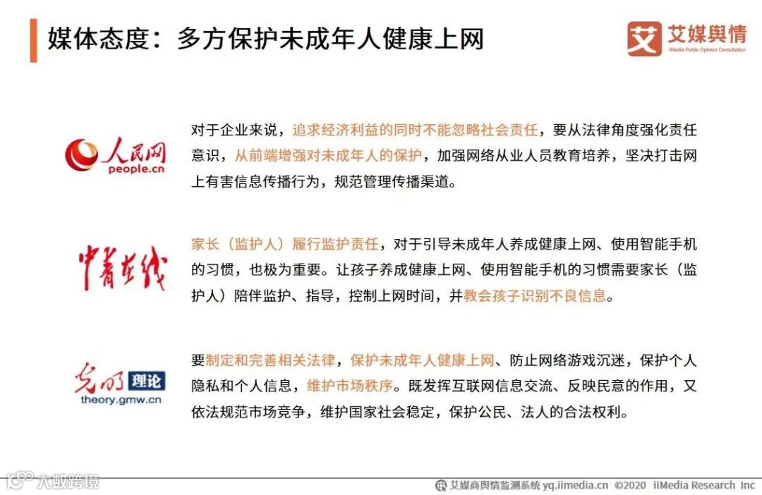 对于此次事件,头条、微博、微信等公众平台都引来用户热烈讨论,并以负面评论为主。人民网也发表评论,表示企业在“追求经济利益的同时不能忽略社会责任,要从法律角度强化责任意识,从前端增强对未成年人的保护”,强调企业需要担负起维护青少年健康网络环境的责任。
