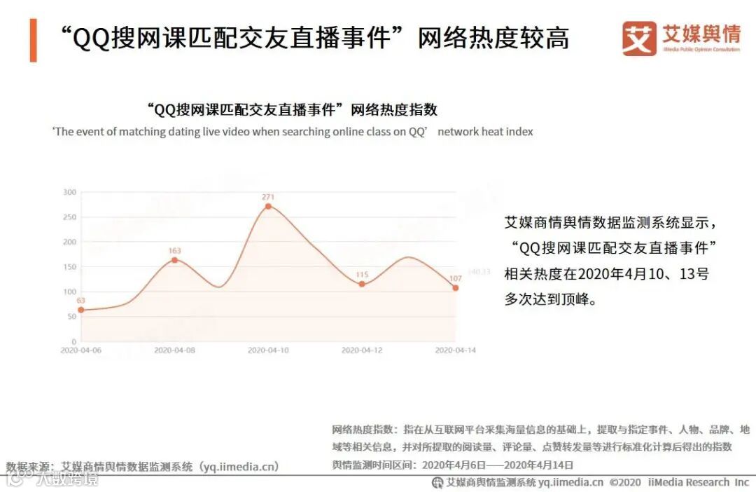 艾媒商情舆情数据监测系统显示,“QQ搜网课匹配交友直播事件”相关热度在2020年4月10、13号多次达到顶峰。