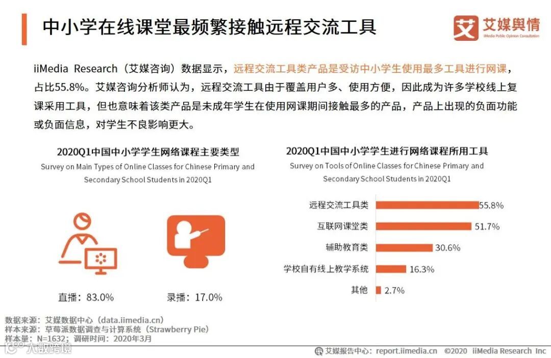 iiMediaResearch(艾媒咨询)数据显示,远程交流工具类产品是受访中小学生使用最多工具进行网课,占比55.8%。艾媒咨询分析师认为,远程交流工具由于覆盖用户多、使用方便,因此成为许多学校线上复课采用工具,但也意味着该类产品是未成年学生在使用网课期间接触最多的产品,产品上出现的负面功能或负面信息,对学生不良影响更大。