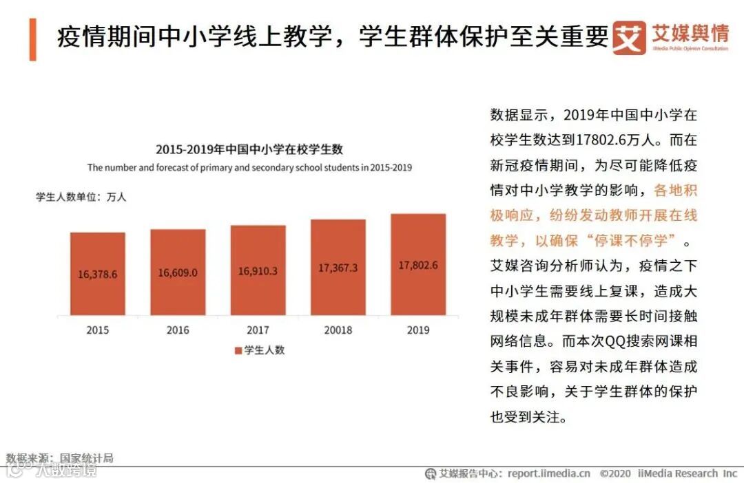 数据显示,2019年中国中小学在校学生数达到17802.6万人。而在新冠疫情期间,为尽可能降低疫情对中小学教学的影响,各地积极响应,纷纷发动教师开展在线教学,以确保“停课不停学”。艾媒咨询分析师认为,疫情之下中小学生需要线上复课,造成大规模未成年群体需要长时间接触网络信息。而本次QQ搜索网课相关事件,容易对未成年群体造成不良影响,关于学生群体的保护也受到关注。