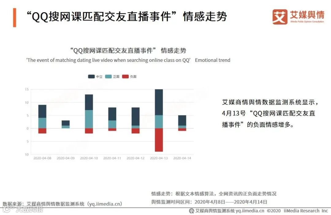 艾媒商情舆情数据监测系统显示,4月13号“QQ搜网课匹配交友直播事件”的负面情感增多。