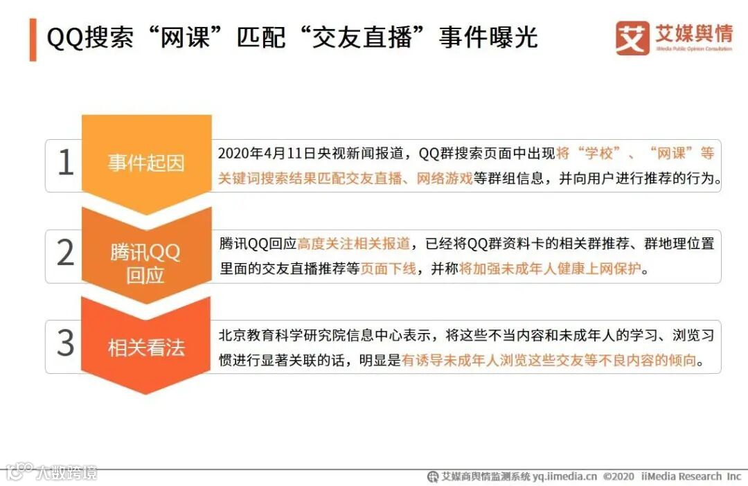 以上内容源自艾媒咨询发布《2020QQ搜索“网课”匹配 “交友直播”事件舆情监测报告》,完整版共24页。