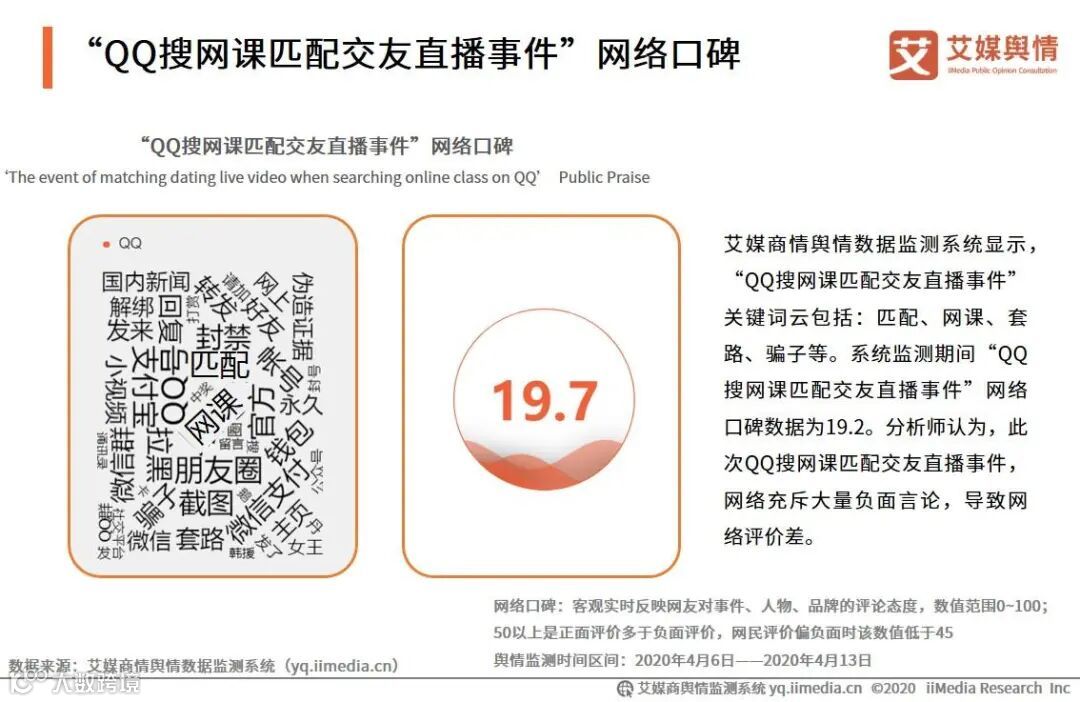 艾媒商情舆情数据监测系统显示,“QQ搜网课匹配交友直播事件”关键词云包括:匹配、网课、套路、骗子等。系统监测期间“QQ搜网课匹配交友直播事件”网络口碑数据为19.2。分析师认为,此次QQ搜网课匹配交友直播事件,网络充斥大量负面言论,导致网络评价差。