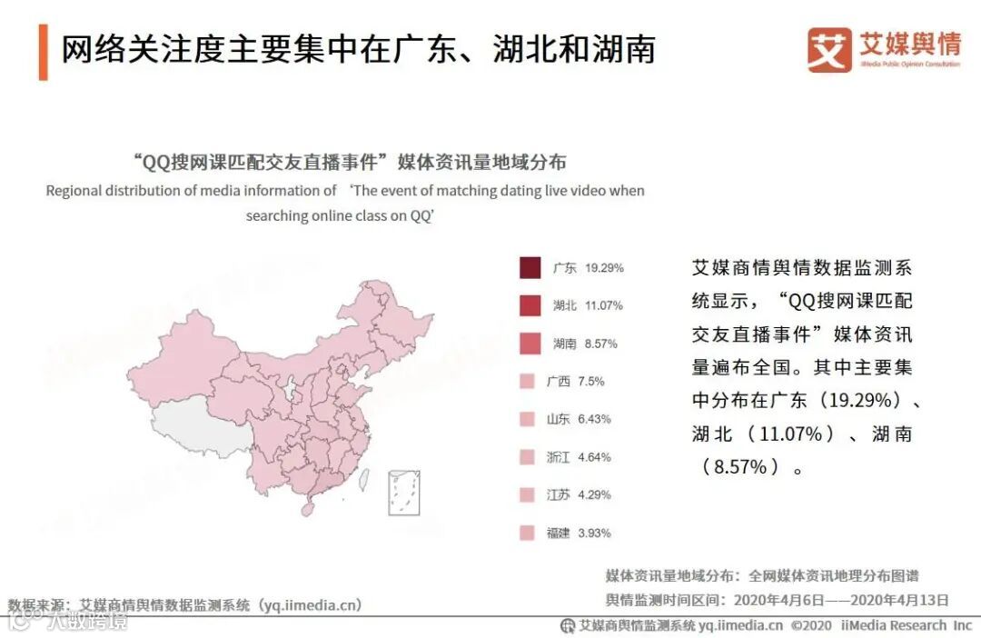 艾媒商情舆情数据监测系统显示,“QQ搜网课匹配交友直播事件”媒体资讯量遍布全国。其中主要集中分布在广东(19.29%)、湖北(11.07%)、湖南(8.57%)。