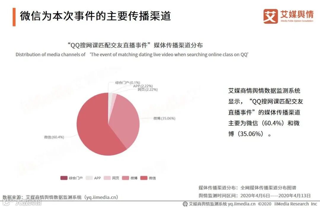 艾媒商情舆情数据监测系统显示,“QQ搜网课匹配交友直播事件”的媒体传播渠道主要为微信(60.4%)和微博(35.06%)。