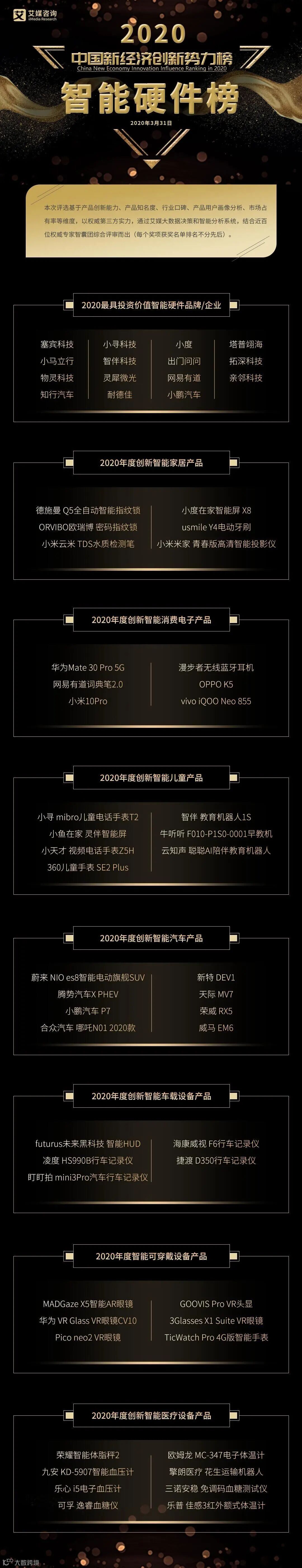 iiMedia Research(艾媒咨询)最新发布了《2020中国新经济创新势力榜-智能硬件榜》,本榜单由艾媒大数据决策和智能分析系统,结合近百位权威专家智囊团综合评审而出。包含了最具投资价值智能硬件企业,创新智能家居产品,创新智能消费电子产品,创新智能儿童产品,创新智能汽车产品,创新智能车载设备产品,智能可穿戴设备产品,创新智能医疗设备产品共8个奖项。