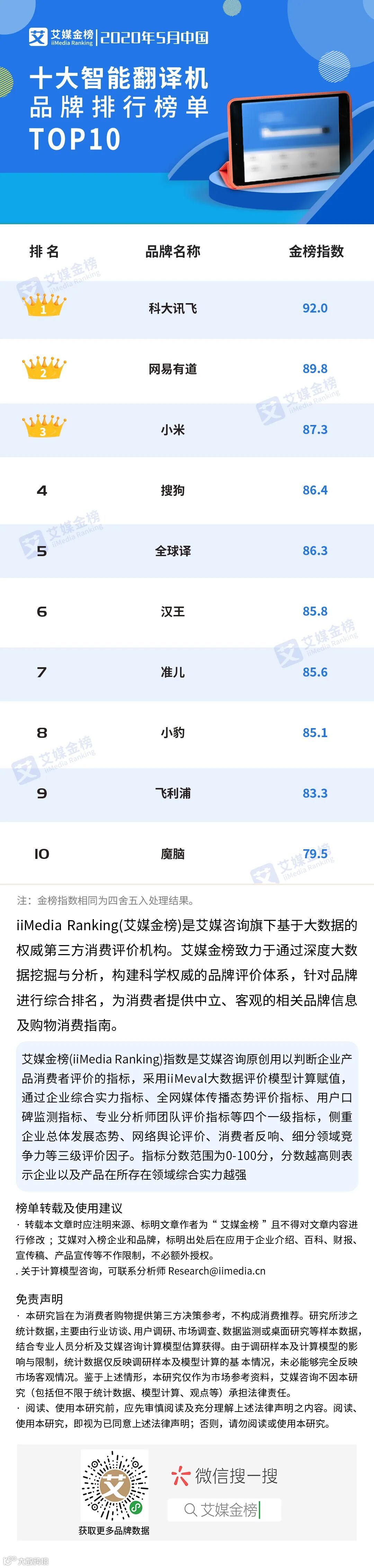 iiMedia Ranking艾媒金榜最新发布《2020Q1中国十大智能翻译机品牌排行榜单》,本次上榜《2020Q1中国十大智能翻译机品牌排行榜单》的有科大讯飞、网易有道、小米、搜狗、全球译、汉王、准儿、小豹、飞利浦、魔脑。其中科大讯飞以92.0的金榜指数高居第一,网易有道、小米分别以89.8、87.3的金榜指数分居第二、第三名。