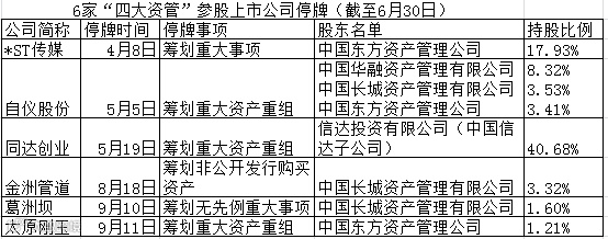 典型案例是*ST传媒和自仪股份。其中,因实际控制人湖南财信投资正在筹划与公司相关的重大事项,*ST传媒自今年4月8日停牌至今已近6个月;自仪股份则于5月5日起停牌至今,公司拟将全部资产及负债置出,并以发行股份购买上海临港经济发展(集团)下属部分园区开发类资产等多种重组方式进行重大资产重组,交易完成后,上市公司实际控制人将变更为临港集团,公司的主营业务将变更为园区开发类业务。东方资产是*ST传媒的第二大股东,持股17.93%,同时其持有自仪股份3.41%的股权。