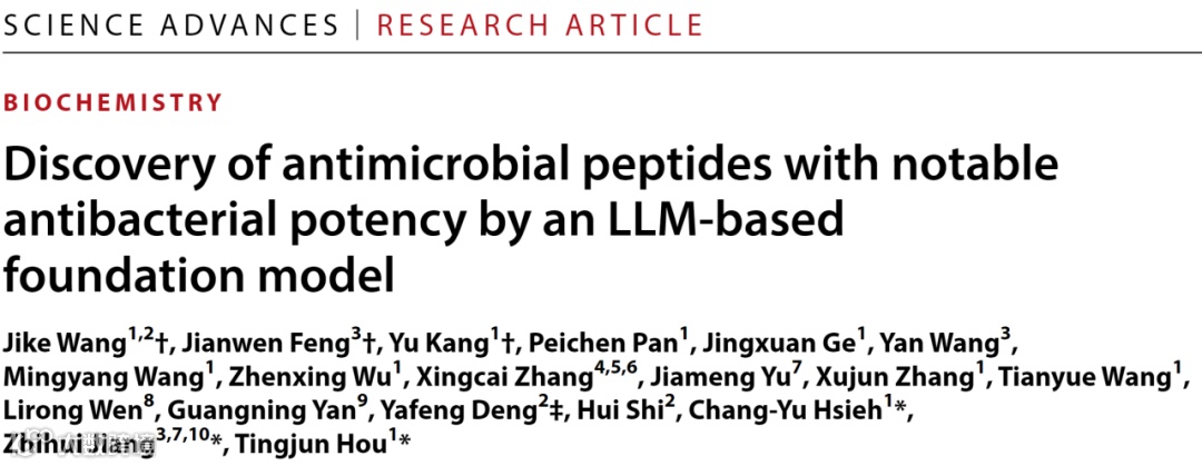 Wang J, Feng J, Kang Y, et al., Discovery of antimicrobial peptides with notable antibacterial potency by an LLM-based foundation model. Sci. Adv.11, eads8932(2025).