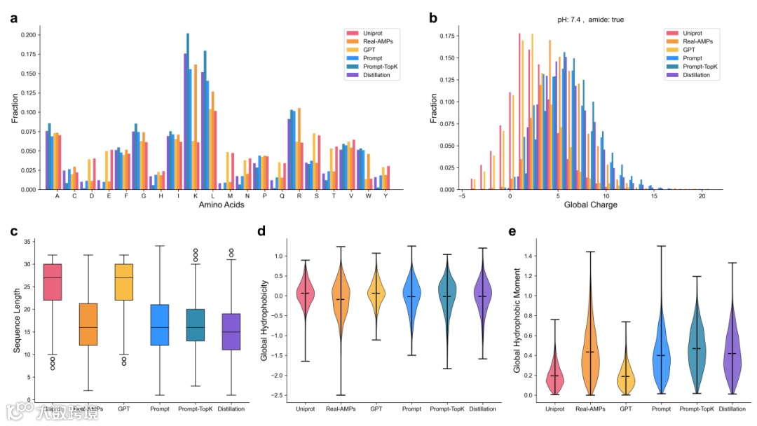 首先对生成多肽的理化性质分布进行可视化。如图2所示,AMP-GPT生成的肽的理化性质分布与UniProt训练数据集的分布相似。这一结果表明,AMP-GPT有效地学习了UniProt训练数据集中肽的理化特征。在对比提示学习之后,这些新生成的肽的性质更接近真实的抗菌肽,这表明提示微调是有效的。作者在提示学习后进一步采用了top-k采样法生成肽,发现与传统的基于温度的采样方法相比,top-k采样得到的肽的分布具有更高的全局电荷,且其理化性质更类似于真实抗菌肽。最后,蒸馏模型生成的肽序列的理化性质分布与教师模型生成的高度相似,这表明它成功学习到了教师模型的概率分布。