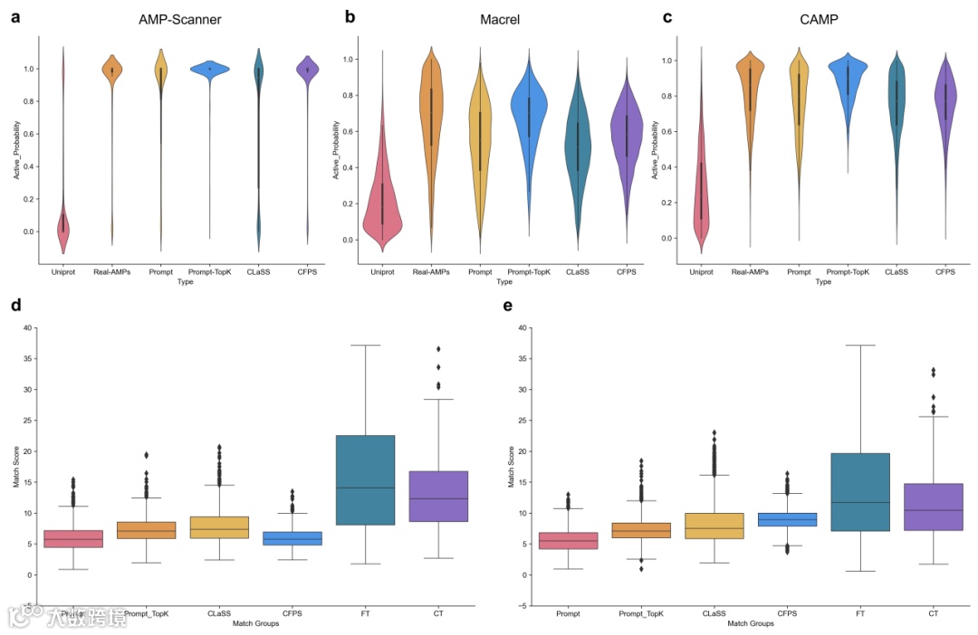 为评估所生成的肽,作者运用了三种不同的抗菌肽分类器来评估模型生成多肽的抗菌能力。图3a-c展示了基于提示的模型在所有三个预测器中的性能有显著提升。特别是,由Prompt-TopK生成的肽展现出与真实抗菌肽极为相似的生物活性分布。通常,当预测器输出为0.5或更高时,会将一个序列判定为有活性的抗菌肽。显然,各种模型生成的候选抗菌肽的性能在所有三个预测器中均与预期相符。值得注意的是,AMP-GPT展现出强大的从UniProt中的肽数据学习的能力,因为所生成的肽在所有三个预测器中的活性概率分布与来自UniProt的肽序列相似,始终低于0.5。然而,经过提示微调,该模型生成的候选抗菌肽的活性概率与真实抗菌肽相当。尤其是,Prompt-TopK变体的性能甚至超过了真实抗菌肽,概率集中在1附近。为进一步探究生成肽的多样性,作者进行序列比对,并计算生成序列的匹配分数(图3d-e)。结果显示,与其他模型相比,本研究提出的方法生成的多肽序列有着不错的多样性。