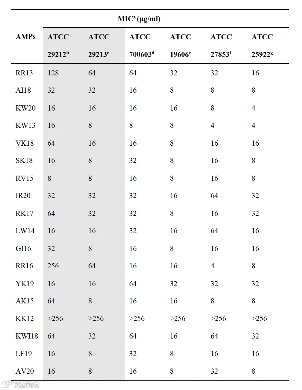 作者对预测排名前20种候选抗菌肽展开体外抗菌活性测试(2个肽未能成功合成)。首先,测定了这些抗菌肽针对ESKAPE病原体六种标准菌株的MIC值。如表1所示,18种候选抗菌肽中有17种对至少一种菌株展现出显著抗菌活性。此外,这些最初针对铜绿假单胞菌和大肠杆菌设计的抗菌肽,对肺炎克雷伯菌和鲍曼不动杆菌也表现出显著活性。AI18、KW13、KW20、RV15和GI16对革兰氏阴性菌(MIC范围为4至16μg/ml)和革兰氏阳性菌(MIC范围为8至32μg/ml)表现出相对最高的抗菌活性。