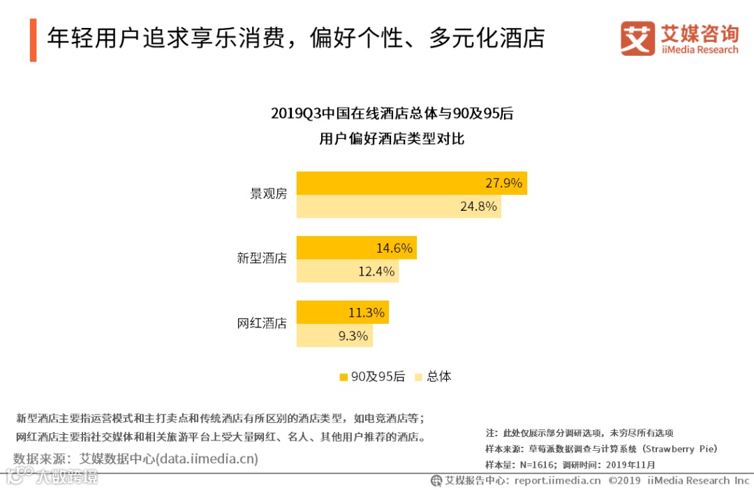 与此同时,在互联网背景下成长起来的新生代消费者已悄然成为市场消费主体,他们崇尚个性消费,追求自我,强调“品质”的同时也要“实惠”。根据艾媒咨询调查,90及95后用户对景观房、新型酒店、网红酒店消费偏好更为强烈,相较总体分别高出3.1%、2.2%及2.0%。