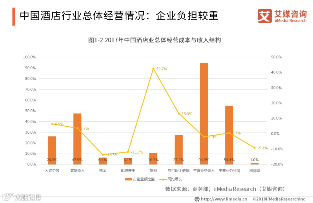 iiMedia Research(艾媒咨询)数据显示,2017年,中国酒店应付职工薪酬为营业额的27.2%,较上年增长13.3%;房租为营业额的10.7%,较上年增加42.7%。成本费用的上涨抵消了营业额增长的空间。总体来看,酒店行业企业负担较重,利润率仅为1.0%,比上年下降9.1%,盈利水平低,面临转型压力。
