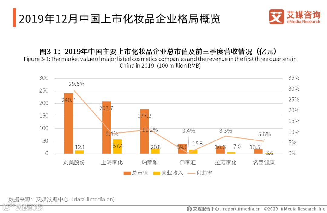 中国目前本土的日化上市企业主要有上海家化、拉芳家化、珀莱雅、名臣健康、御家汇以及2019年7月在上交所上市的丸美。从2019年12月31日中国上市化妆品企业的总市值来看,丸美股份排名第一,达到了240.7亿元,超过了上市较长时间的上海家化,珀莱雅的市值紧随其后,且利润率超过上海家化。从2019年前三季度的营收来看,上海家化达到了57.4亿元,领先于其他上市企业前三季度的营收,但从利润率来看,丸美股份的利润率达到了29.5%,在中国多家化妆品上市企业中排在第一位,在中国化妆品市场看好的大背景下,多家化妆品企业的发展潜力可观。