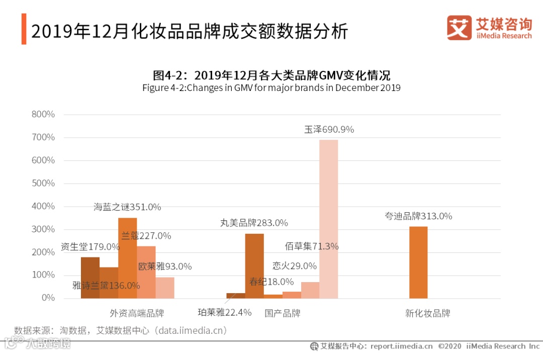 据2019年12月各大类品牌GMV变化情况数据显示,主流的外资高端品牌普遍增速强劲;国产品牌也有取得出色进步的品牌,其中玉泽的成交额同比增长了690.9%,丸美品牌的成交额同比增长了283.0%,国产品牌的分化现象加剧;其中华熙生物旗下夸迪品牌12月全网GMV增速约313%。