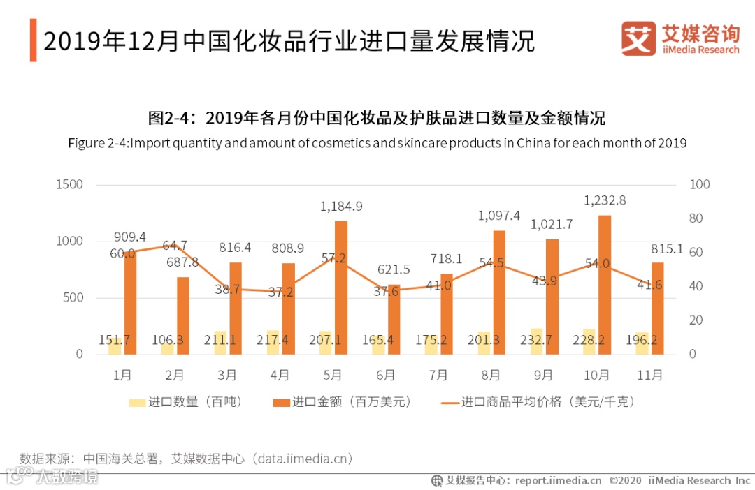 随着中国经济的发展,同时在消费升级的促进之下,中国消费者对高端化妆品的进口需求明显增加。数据显示,2019年1-11月中国美容化妆品及护肤品进口量为209227吨,同比增长11.5%,从金额方面来看,2019年1-11月中国美容化妆品及护肤品进口金额为8315百万美元,同比增长38.4%。艾媒咨询分析师认为,中国化妆品行业的进口量相比于出口量有更大的增长幅度,一方面说明中国中高端化妆品市场需求潜力巨大,另一方面也说明中国本土化妆品牌将面临更激烈的市场竞争。
