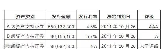外贸信托作为受托机构向投资者发行资产支持证券,以信托财产产生的现金流为限支付资产支持证券的收益。证券分为三级,分别为A级资产支持证券、B级资产支持证券和次级资产支持证券。次级资产支持证券的受偿顺序后于A级和B级资产支持证券,B级资产支持证券的受偿顺序后于A级资产支持证券。当原债务人发生违约时,次级资产证券首先承担违约损失,次级资产证券不足以承担的,由B级支持证券按比例来承担,B级支持证券仍不足以承担的,由A级资产支持证券按比例承担。A级和B级资产支持证券由国泰君安作为主承销商在银行间市场公开发行,次级资产支持证券由主承销商向投资者定向发行。