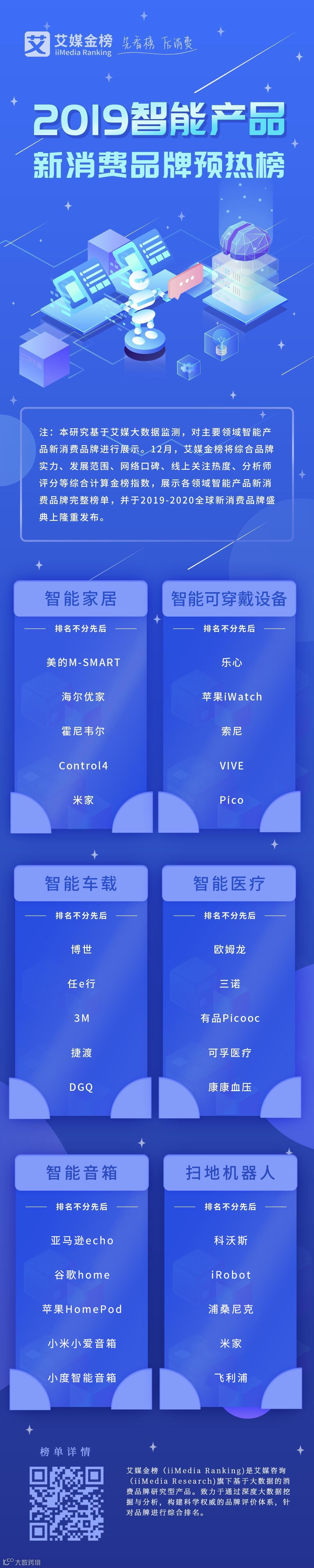 艾媒金榜(iiMedia Ranking)推出《2019-2020全球新消费势力榜智能产品预热榜》,展示部分智能产品品牌名单,领域涉及智能家居、智能可穿戴设备、智能车载、智能医疗、智能音箱、扫地机器人。