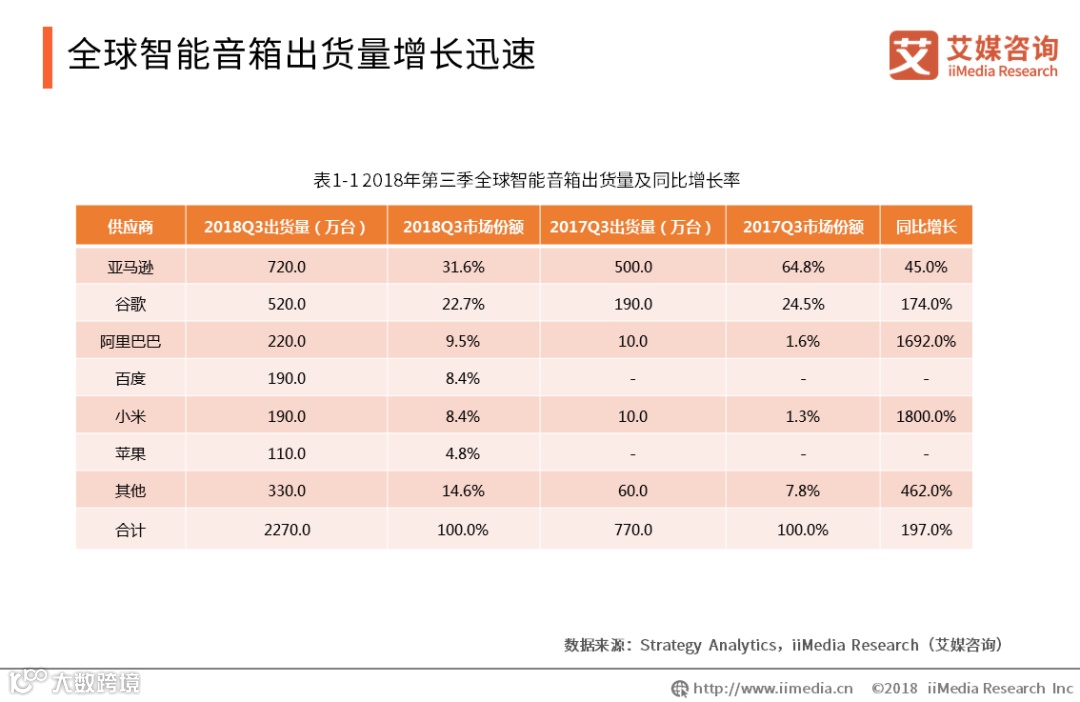 数据显示,2018年第三季全球智能音箱出货量同比增长197.0%,达到2270万台,创下历史新高,发展速度高于过去10年推出的其他消费电子产品,2018年全球智能音箱的销量预计突破1亿大关。