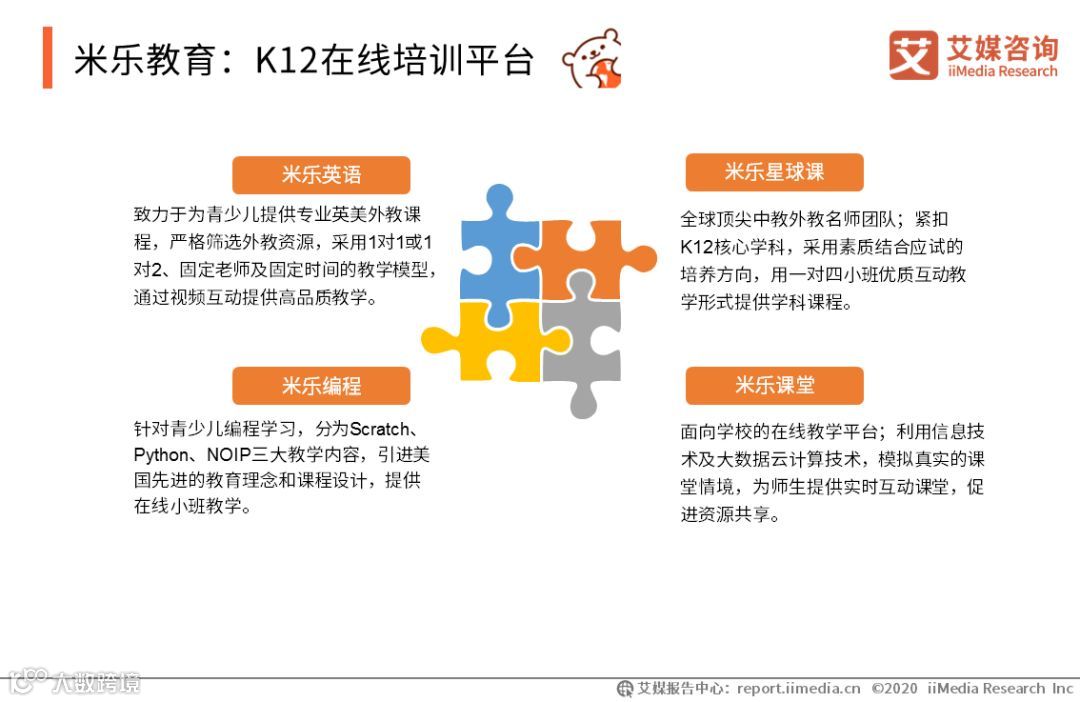 米乐教育是米络星集团旗下的在线K12青少儿教育培训平台,既有面向学生用户群体也有面向学校教育机构的服务。目前拥有米乐英语、米乐星球课、米乐课堂、米乐编程等产品。