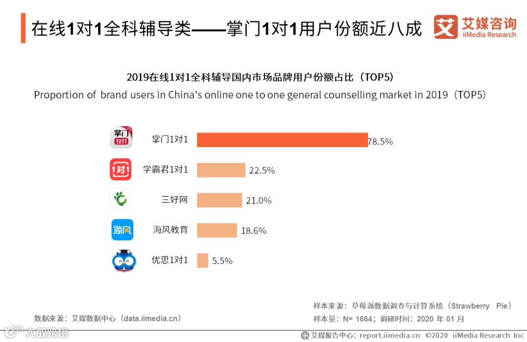 iiMedia Research(艾媒咨询)数据显示,在线1对1全科辅导类用户份额占比调查中,78.5%用户偏好于选择掌门教育旗下品牌掌门1对1。艾媒咨询分析师认为,K12在线1对1全科辅导类行业格局基本形成,掌门1对1在在线1对1全科辅导领域上占据领先优势,未来将进一步优化盈利模型。