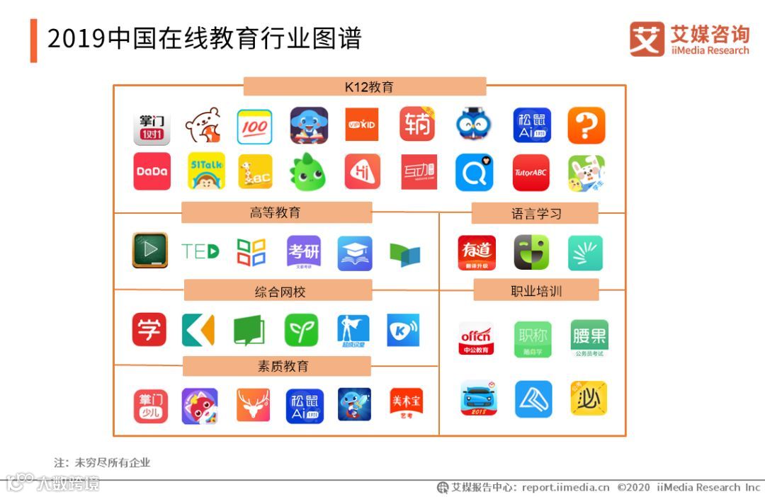 编程猫,松鼠AI,英孚青少儿英语,DaDa英语,好未来集团,掌门教育,作业帮,猿辅导,阿卡索少儿英语,米乐教育,考研帮,学堂在线,尚德机构,MOOC学院,海风教育,学而思网校,新东方在线教育,VIPKID,中公教育,网易云课堂,忧思1对1,三好网,学霸君1对1,驾考大全,元贝驾考,车轮驾考通,驾校一点通,伴鱼绘本,宝贝听听,口袋故事,宝宝巴士儿歌,小伴龙,驾考宝典等
