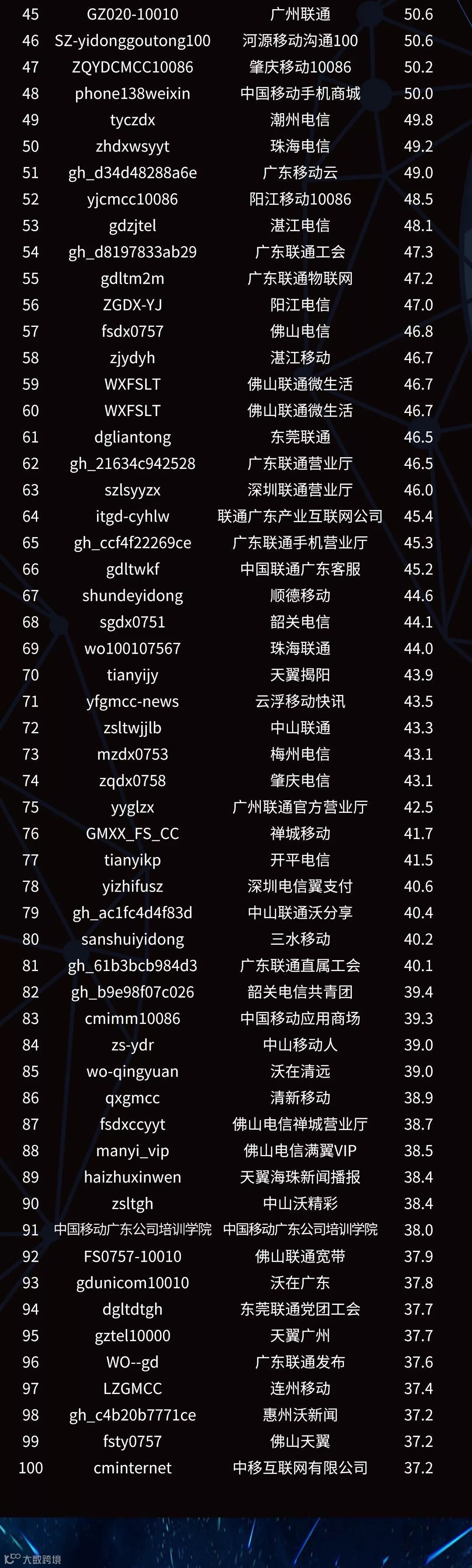 日前,iiMedia Research(艾媒咨询)发布了《2019广东运营商微信公众号影响力排行榜TOP100》,本榜单基于艾媒大数据监测,对运营商公众号发文密度、文章阅读数、文章在看数、高影响力文章发布情况、高影响力文章阅读量等综合计算的指数。