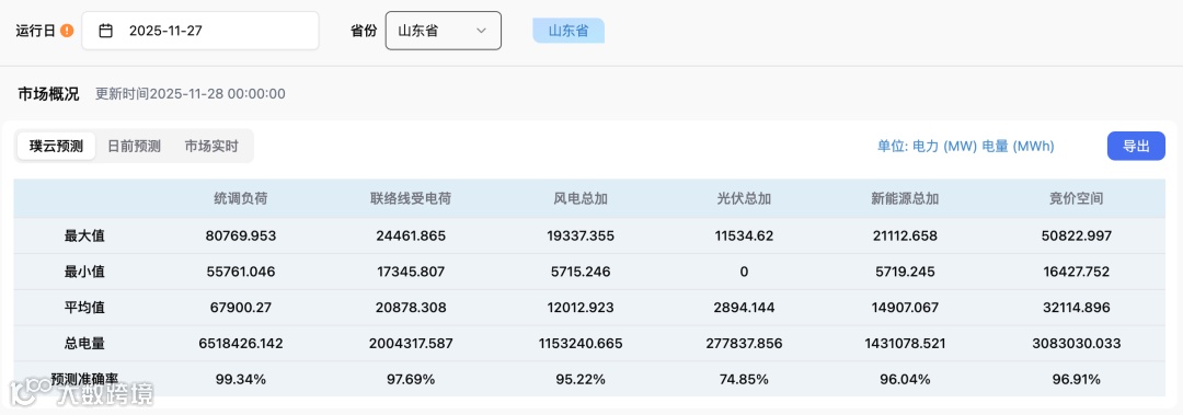 市场边界预测功能全新升级算法,覆盖统调负荷、联络线受电负荷、风电总加、光伏总加、新能源总加以及竞价空间 6类核心指标,预测准确率最高达 98.97%,助力精准判断市场供需趋势。