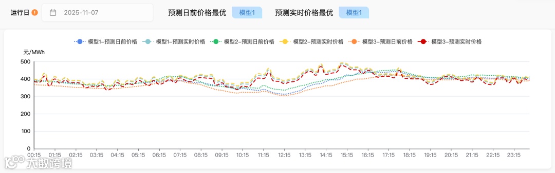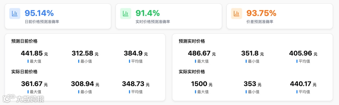 短期预测覆盖预测日前价格、预测实时价格两大核心维度,提供与实际电价的直观对比及精准预测准确率。