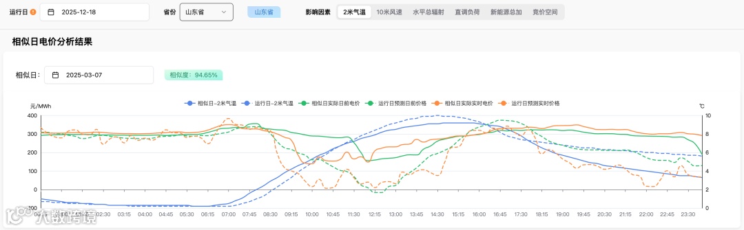 相似日电价分析可基于近1年历史数据,从 “温度、风速、太阳辐射、直调负荷、新能源总加、竞价空间”六大维度自动匹配相似日,相似度量化展示,解决单一预测模型 “黑箱” 问题,让预测结果更具说服力。