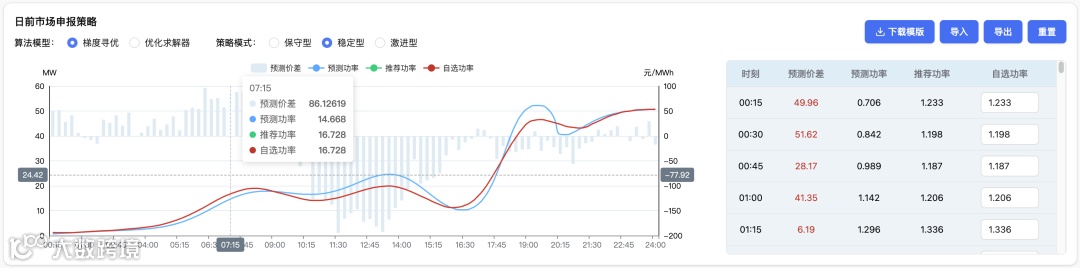 功率申报提供两种智能算法以及保守、稳定、激进三种策略,可根据风险偏好与场站特性,生成定制化的功率申报建议。