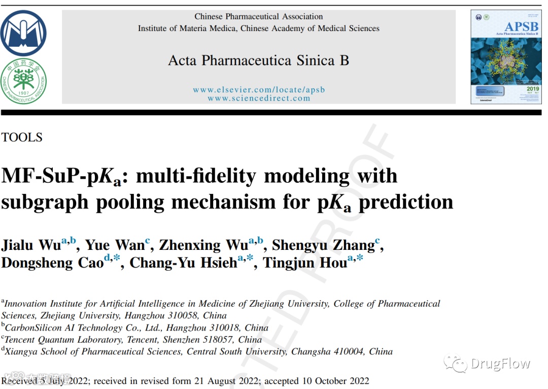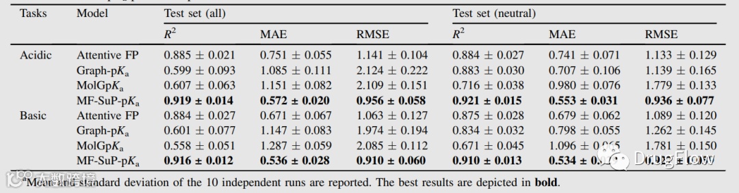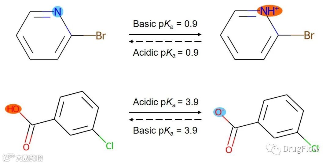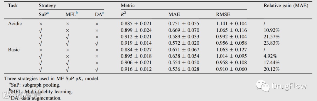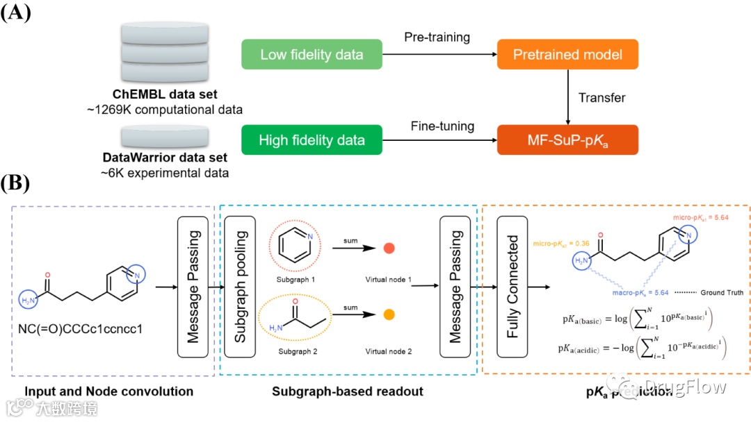 pKa预测:将更新后的子图虚拟节点表征输入全连接层,预测micro-pKa,再通过近似公式转化为macro-pKa,在模型训练时将macro-pKa和已知标签比较,在实际应用时可向用户同时提供micro-pKa和macro-pKa的预测结果: