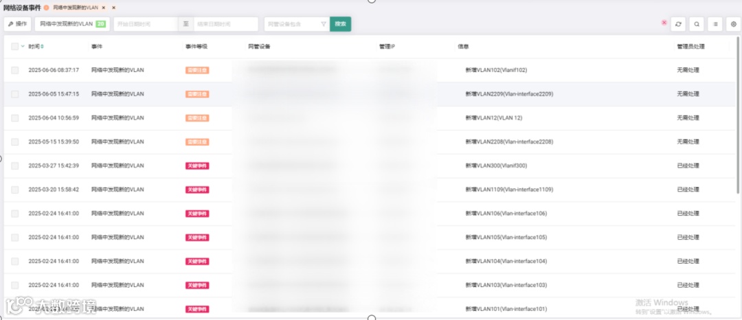 针对IP地址信息登记不及时问题,对接短信网关平台,新IP入网后自动以短信形式通知管理人员完成信息补录;针对网段纳管不全面问题,开展全省范围网段清查工作(图3为扫描到的未纳管网段),将各交换机创建的网段全面纳入管控范围;建立网段动态监控机制,实时跟踪交换机新旧网段启用、删除等变更动作,对网段信息变更事件自动生成代办提醒,由管理员及时处置,确保网段管控无遗漏。