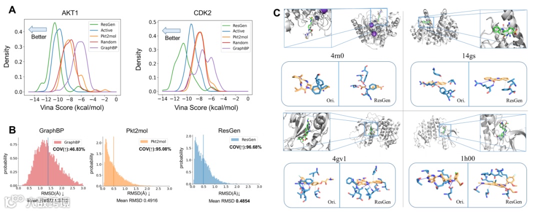 图2:三种方法在代表靶标数据集上结果。A)对接得分分布;B)构象质量实验分布,以RMSD为指标;C)相互作用分析案例。