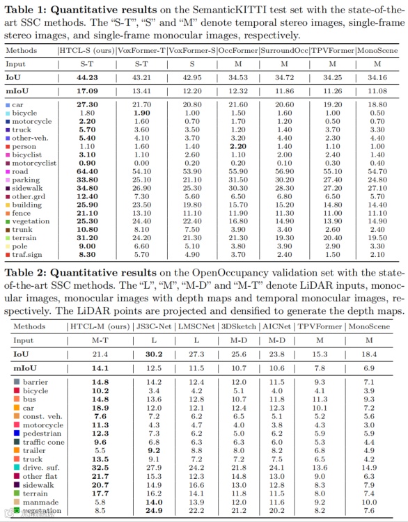 HTCL在SemanticKITTI和OpenOccupancy基准测试中超过了所有基于相机的方法,实现了最先进的性能。
