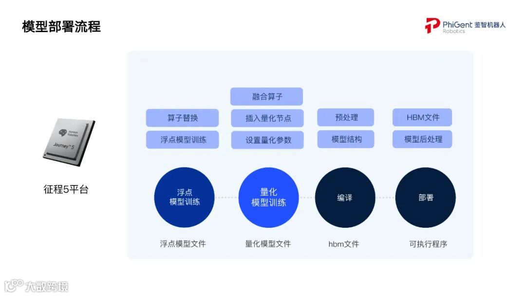 征程5支持 QAT 量化训练和 PTQ 后量化两种方式,鉴智机器人主要采用 QAT 方式。具体部署流程包括浮点模型训练、量化模型训练、编译和部署四步。浮点模型训练中,因鉴智机器人BEV算法无太多特殊计算单元,部署中无需做算子替换,极大提升了部署效率。