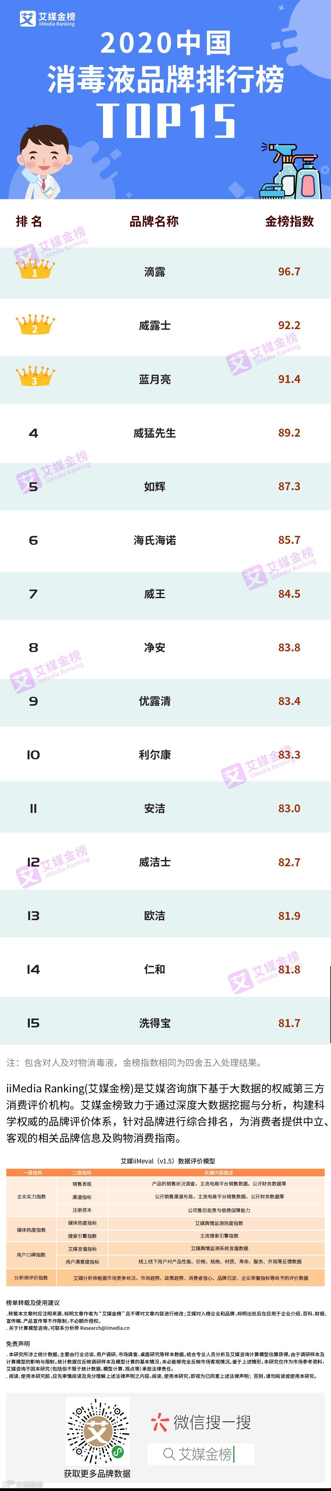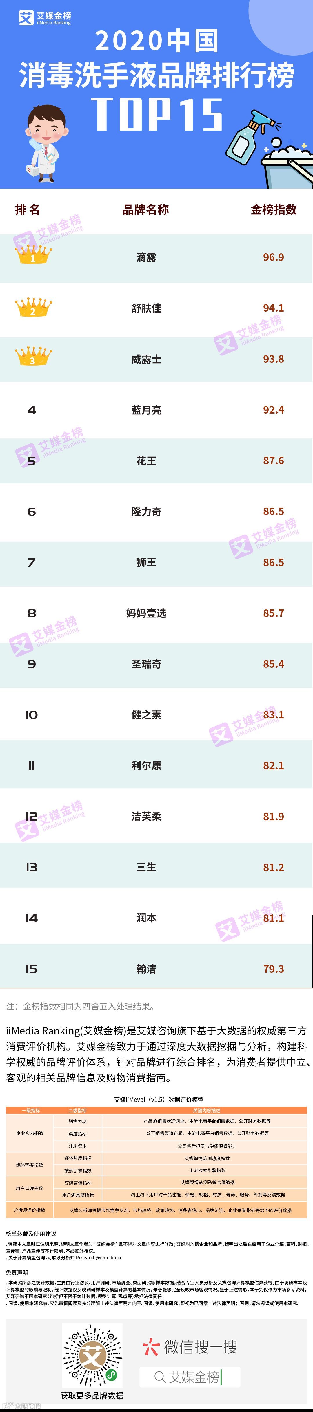 艾媒金榜|《2020中国洗手液&消毒液品牌品排行榜TOP15》公布 艾媒咨询