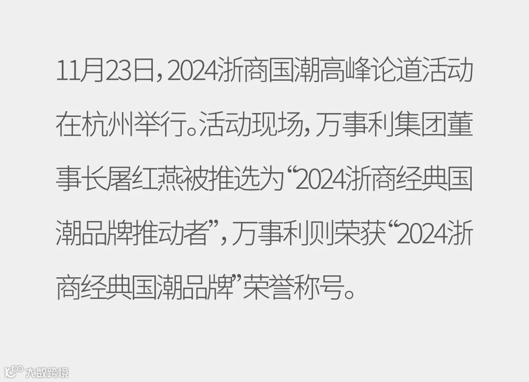 导读:11月23日,2024浙商国潮高峰论道活动在杭州举行。活动现场,万事利集团董事长屠红燕被推选为“2024浙商经典国潮品牌推动者”,万事利则荣获“2024浙商经典国潮品牌”荣誉称号。