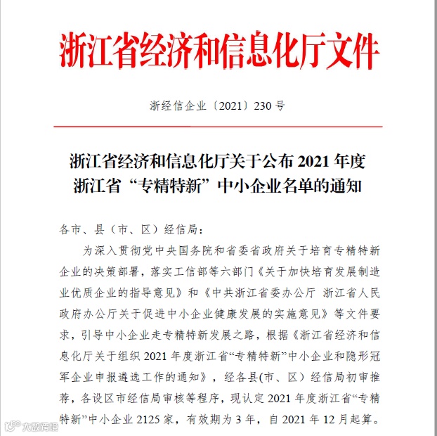 浙江省经济和信息化厅关于公布2021年度浙江省“专精特新”中小企业名单的通知,金盛科技园入驻企业杭州景业科技股份有限公司、杭州哲达科技股份有限公司、杭州迦智科技有限公司突出重围成功入选。