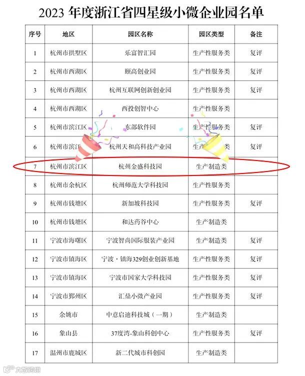 近日,浙江省小微企业园工作联席会议办公室印发了《关于公布2023年度浙江省五星级和四星级小微企业园名单的通知》(浙小微园办〔2023〕4 号)。金盛科技园获得“2023年度浙江省四星级小微企业园”荣誉称号。