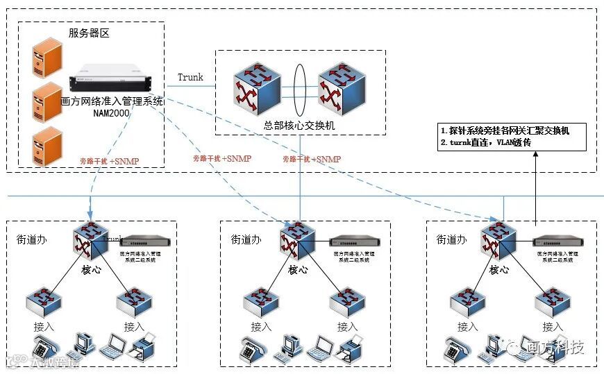 覆盖街道办等单位,网络分布散,且网络复杂,传统依赖交换机大量配置的手段无法适用现有环境。本方案采用不依赖交换机配置、非串联、纯旁路的“1+N”的部署模式,更兼容当前网络环境。