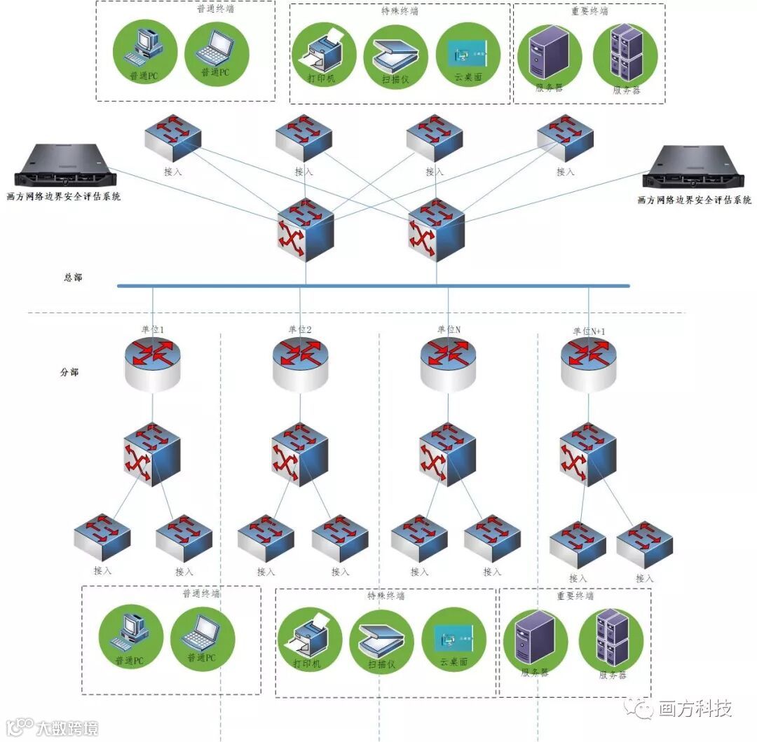 针对以上网络安全隐患,画方科技自主研发的【画方网络边界安全评估系统】能够从网络层实时秒级识别并评估通过各种接入途径(交换机端口、不可网管交换机端口、非法无线AP及NAT等)接入的各种设备(办公电脑、打印机、交换机、IP电话、视频会议终端、摄像头、考勤机、UPS等设备类型)的安全状态,发现各种私接乱接、仿冒的不可信设备,并可以实时告警及阻断,帮助用户构建网络边界的第一道岗哨。