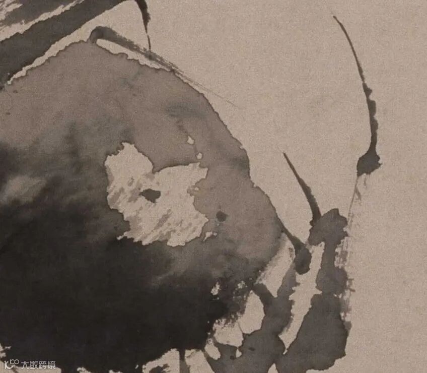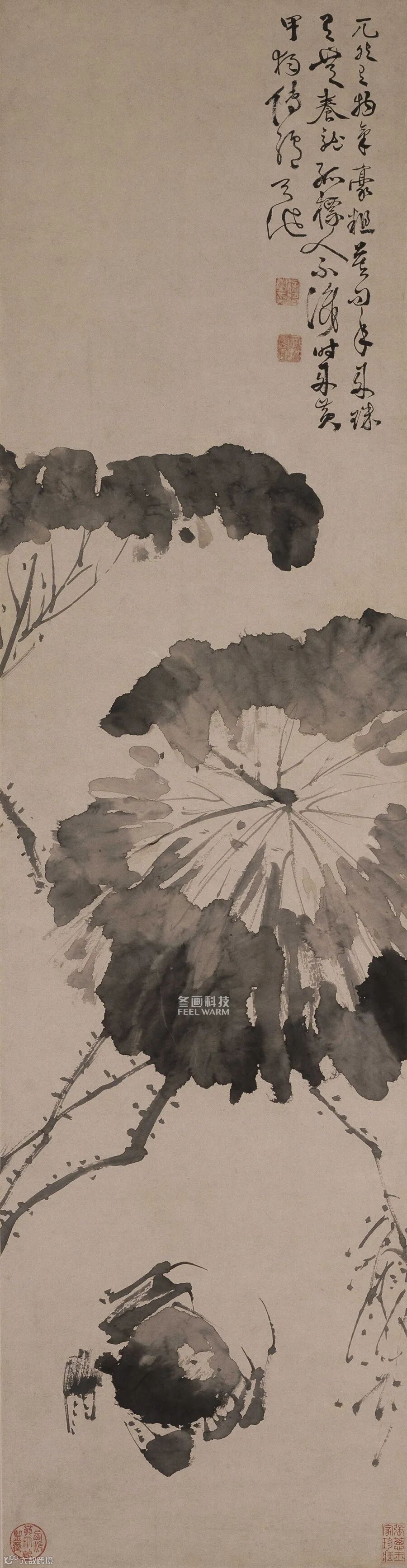 《黄甲图》用笔峭拔劲挺,以奔放而精练的笔墨写出螃蟹的爬行之状和荷叶萧疏的清秋气氛。此画画在生纸上,作画时在墨中加了胶水,这样可以避免水墨渗散,徐渭时喜用此法。蟹的造型,虽寥寥数笔,却浓、淡、枯、勾、点、抹诸多笔法参用,质感、形状、神态历历具足。覆在上面的荷叶,笔阔气贯、偃仰有致,点画之外更寓无尽秋意。